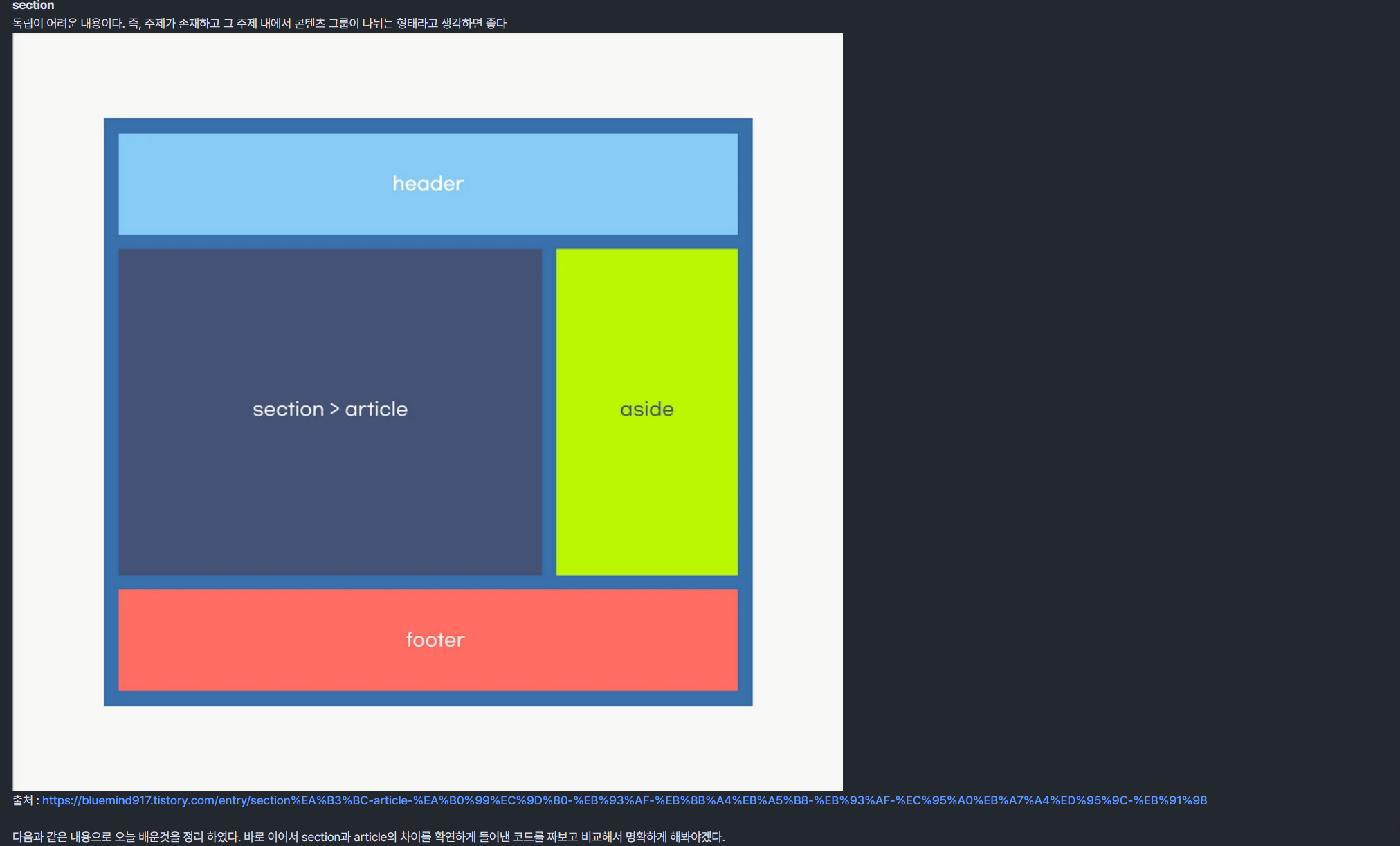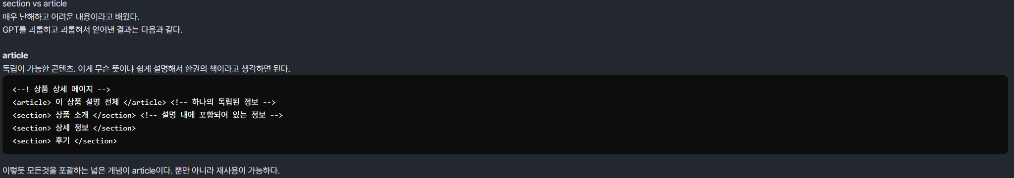 출처 : https://bluemind917.tistory.com/entry/section%EA%B3%BC-article-%EA%B0%99%EC%9D%80-%EB%93%AF-%EB%8B%A4%EB%A5%B8-%EB%93%AF-%EC%95%A0%EB%A7%A4%ED%95%9C-%EB%91%98