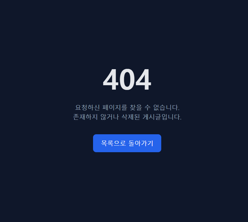 이렇게 404 페이지로 이동하며 목록으로 돌아가기를 누르면 홈으로 돌아가지도록 구현했다.